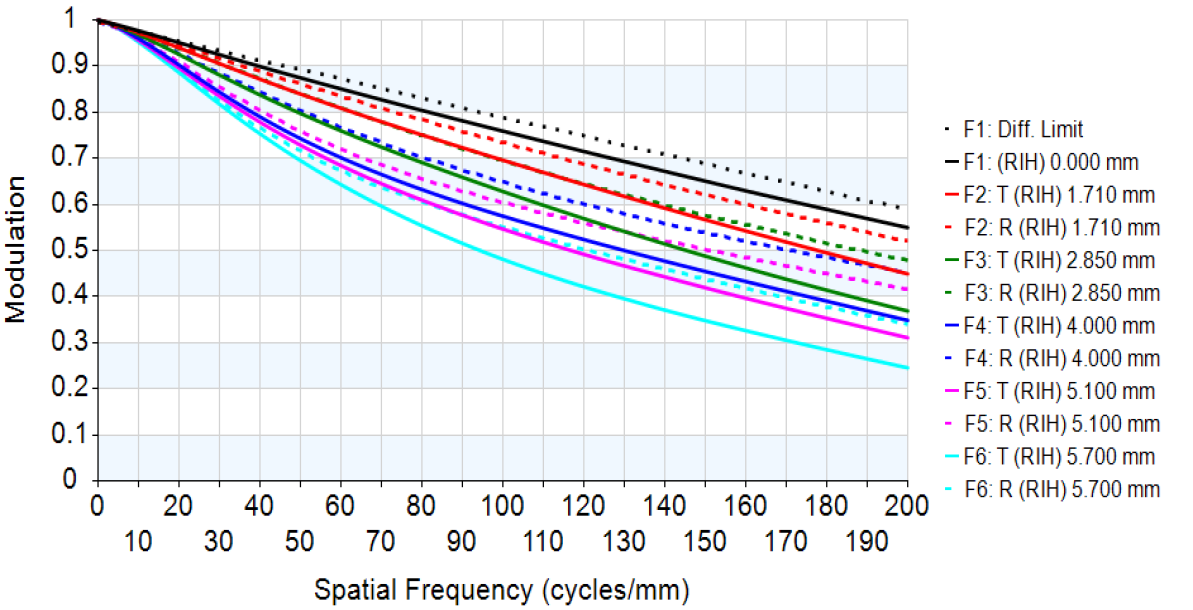 | MTF Measured in the Center at 180 LP/mm / 250 LP/mm (conditions: F2.8, polychromatic, 0.4 m working distance) | 0.59 / 0.46 |