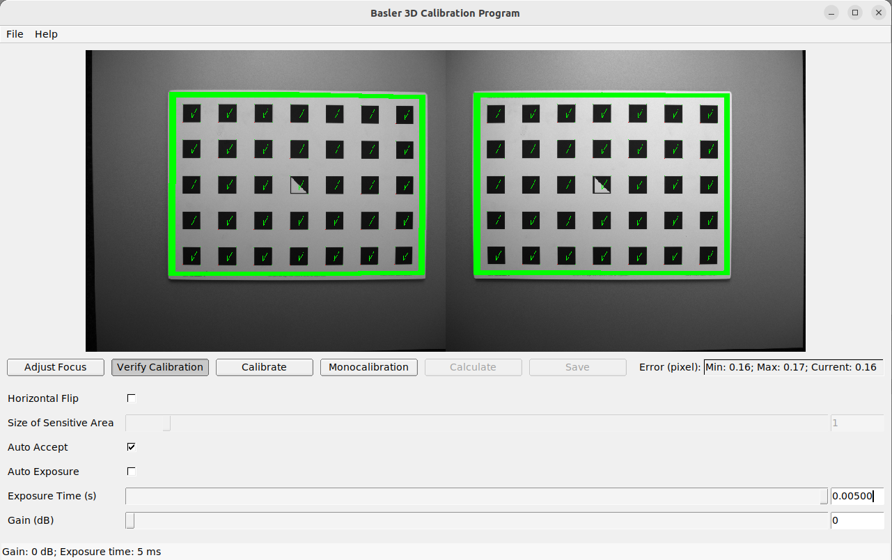 To compute a meaningful calibration error, the grid should be held as close as possible to the cameras. If the grid only covers a small section of the camera images, the calibration error will always be lower than if the grid covers the full image. For this reason, the minimum and maximum calibration errors during verification are shown in addition to the calibration error at the current grid position.