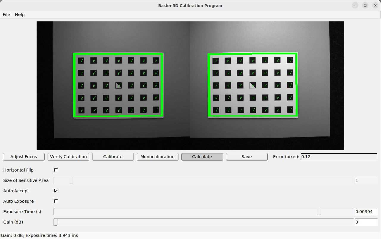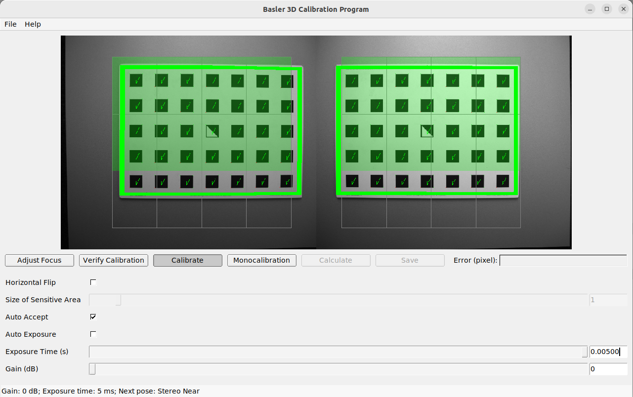 Hold the calibration grid in front of the camera, making sure that all black squares of the grid are completely visible and not occluded in both camera images. Correctly detected squares get a green check mark. All black squares must be detected correctly to ensure proper calibration. If some of the squares are only visible briefly or are not detected at all, bad lighting conditions or a damaged grid may be the cause. Squares in overexposed parts of the calibration grid are highlighted in red. In this case, you must adjust the lighting conditions or exposure settings. A thick green border around the calibration grid indicates that it was detected correctly in both camera images.