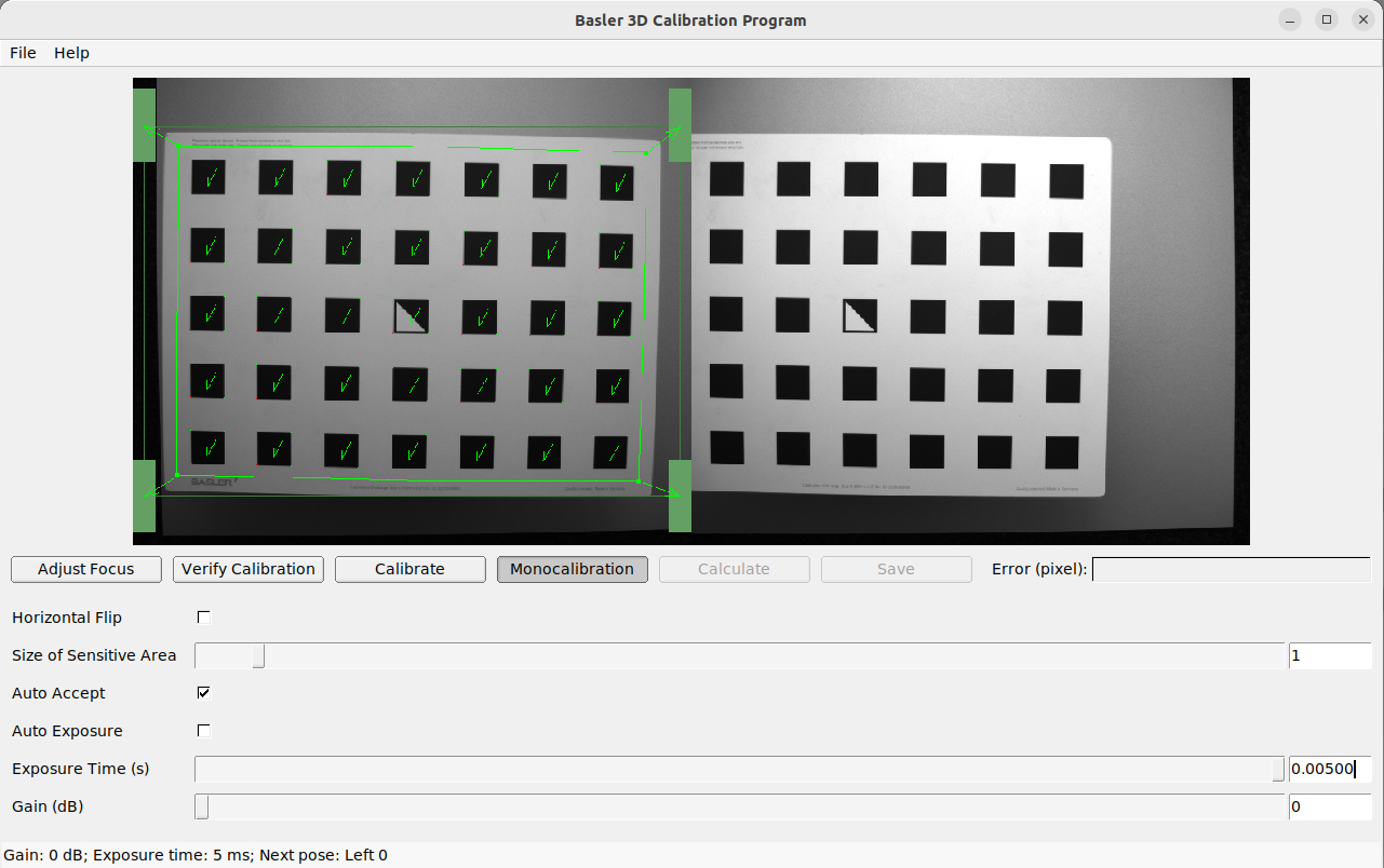 Specify a suitable exposure time before starting the calibration. To achieve good calibration results, the images should be well-exposed and motion blur should be avoided. Therefore, the exposure time should be as short as possible while still allowing a good exposure of the scene.