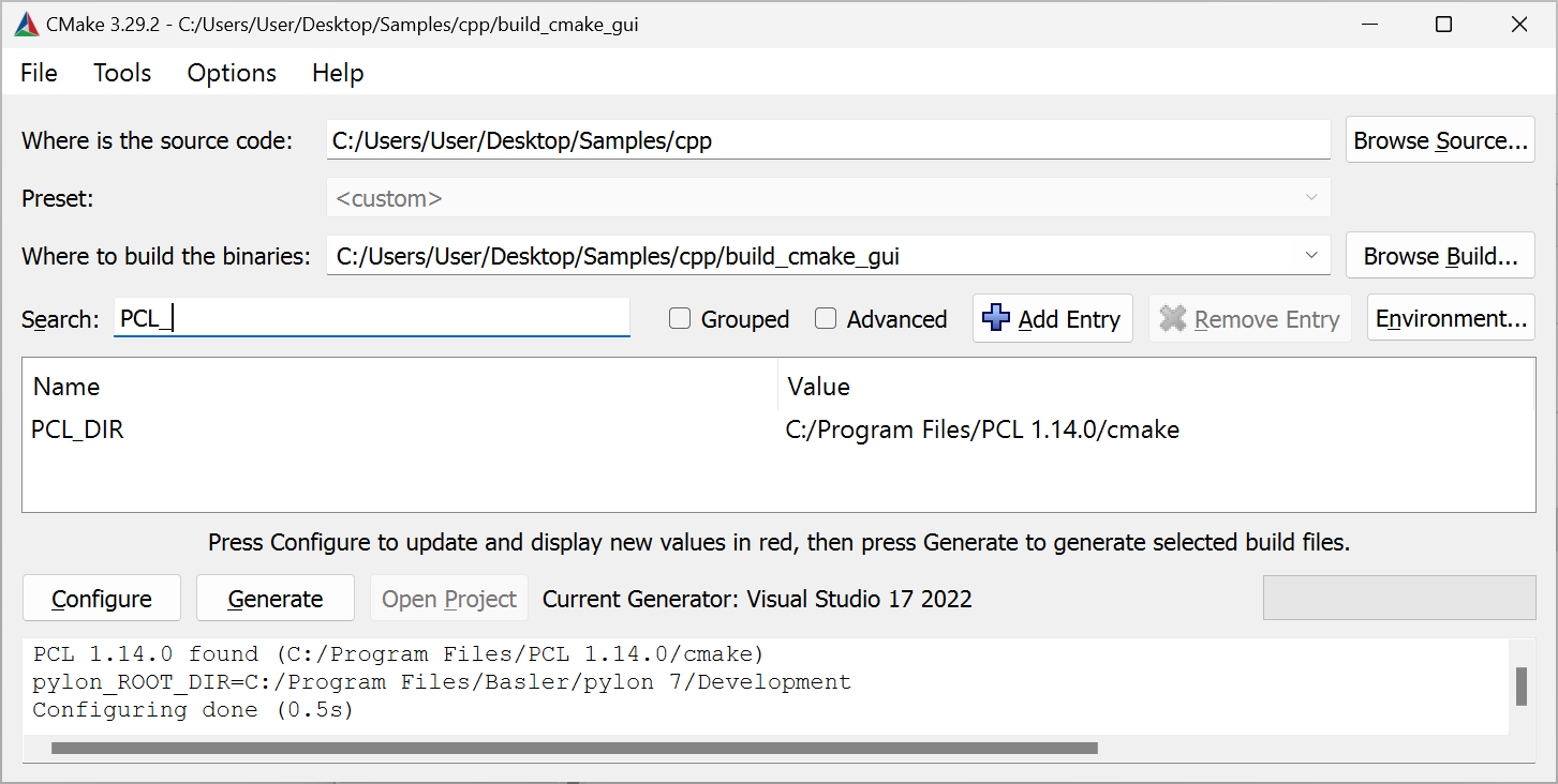 Basler advises against choosing the root folder of the source tree, i.e., the folder this document is located in. Common practice is to create a subfolder (e.g., namedbuild). - Click the Configure button.