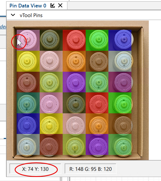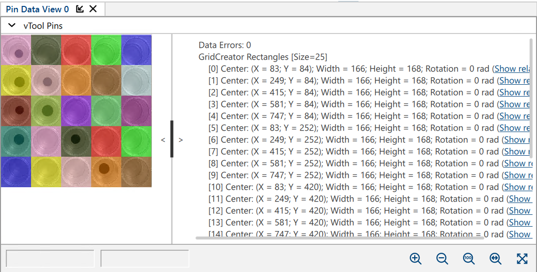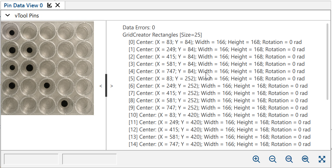 Open a pin data view and select the ImageLoading Image and GridCreator Rectangles pins. If you run the recipe now, you will see that 25 cells have been detected: