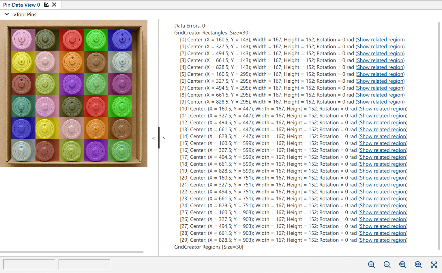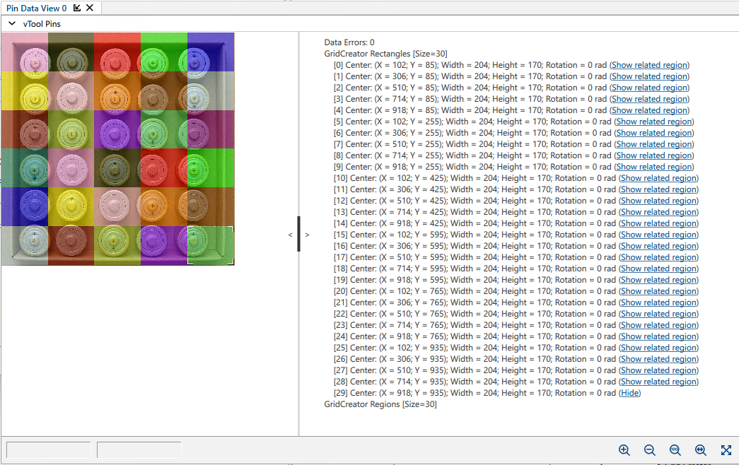 - Open a pin data view and select the Image pin of the image source vTool and the Regions pin of the Grid Creator.