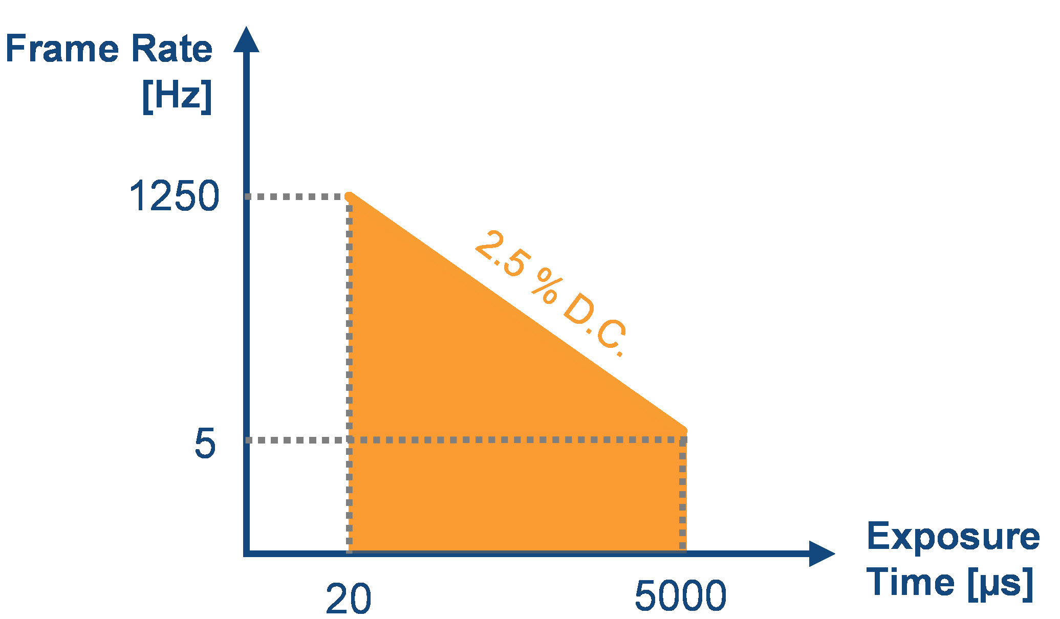 The BslIlluminationDutyCycle parameter displays the resulting duty cycle of the projector. The maximum duty cycle is 2.5 %. The achievable frame rate is limited by this duty cycle. To increase the frame rate, reduce the exposure time or illumination strength.