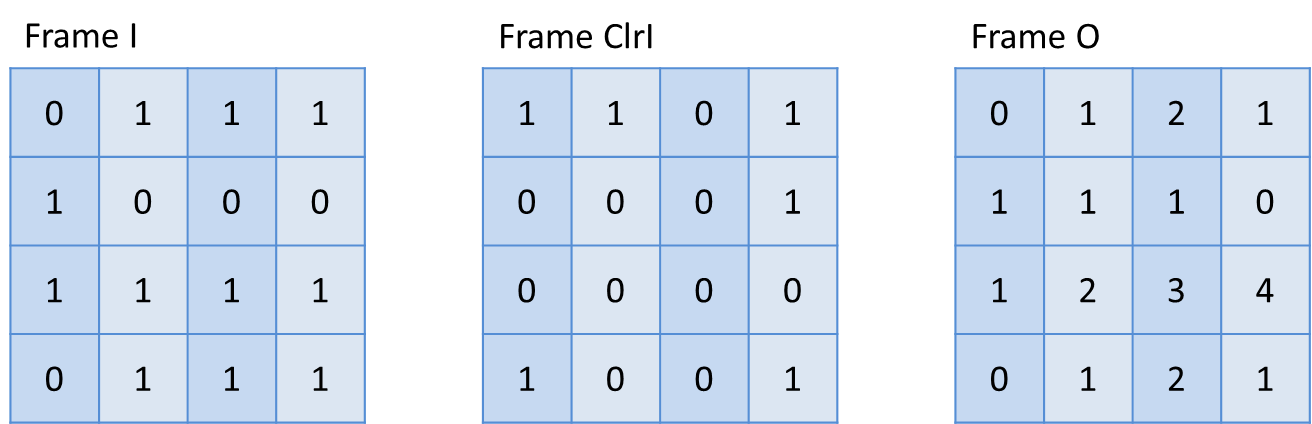The output frame has the same size as the input frame. For every input pixel, the operator will output the current counter value. The counter wraps around if the counter reaches maximum in count-up mode or zero in count-down mode.