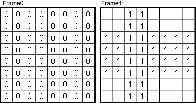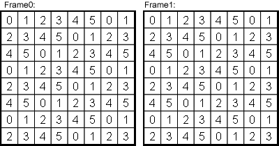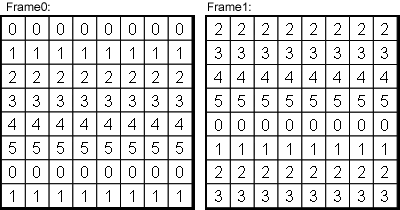 In the following examples the operator's usage is illustrated. First example shows two successive frames which have an image width and image height of eight pixels. All pixel values are illustrated as numbers. Frame index 0 represents the initial frame, i.e. the first frame after acquisition start.