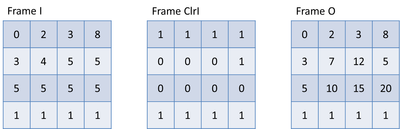 Often, this operator is used in conjunction with operator RemovePixel to use only the last column containing the results of the full frame. Note that the operator will require additional resources with increased parallelism. If only the sum of each row without intermediate results is required, it is possible to determine the sum of the parallel words first.