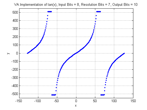 The results of the tangent function are in the range [-∞, ∞]. This operator includes a parameter ResolutionBits to define the fixed point resolution bits of the output values. The output range is therefore given by the number of output bits and the resolution bits =