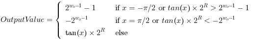 The values -π/2 and π/2 are not defined for the tangent function. The VisualApplets operator will clip these values to the maximum or minimum possible values at the output. Moreover, the result of the tangent function can be out of the output value range. In this case, the results will be clipped to the maximum or minimum possible values, too. Thus,