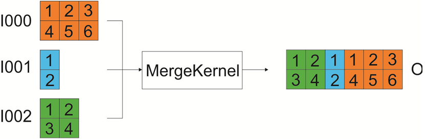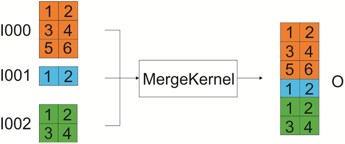 The operator MergeKernel merges an arbitrary number N of input links I[0] .. I[63] (max.) into a single output link O.