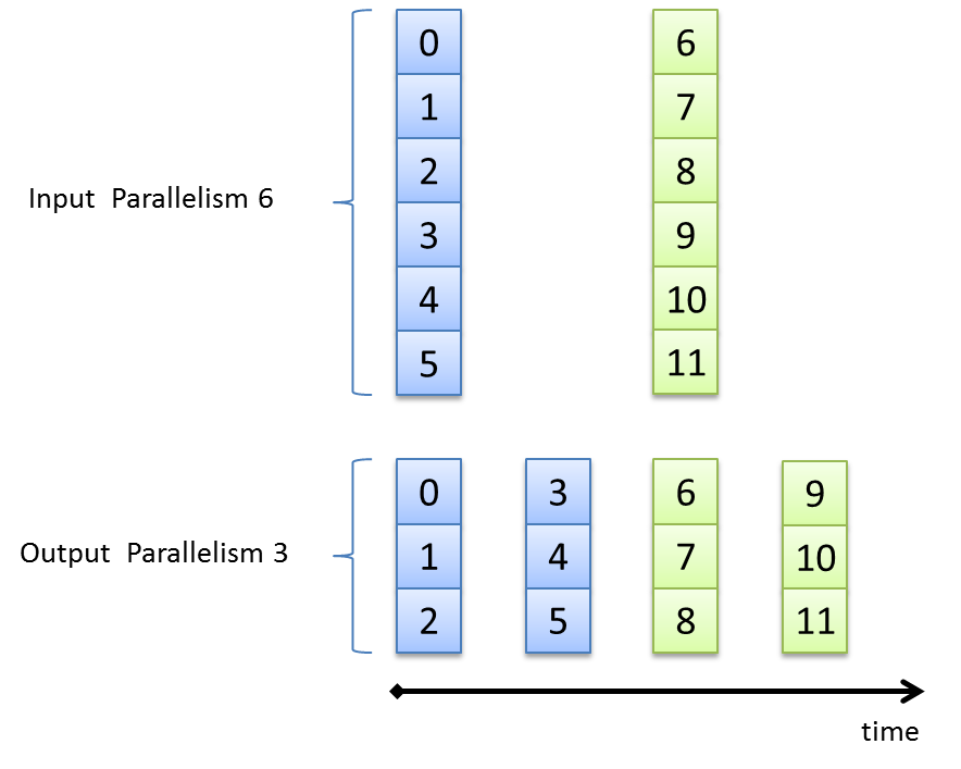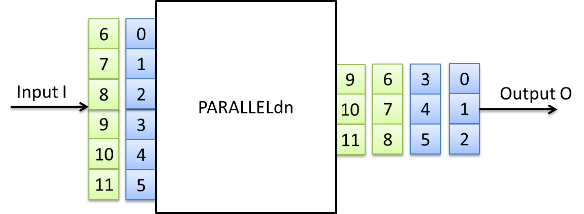 Following figure shows a parallel down conversion from parallelism 6 at the input down to parallelism 3 at the output.