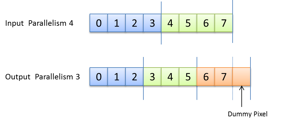 The following figure shows in illustration of this dummy pixel insertion. As can be seen, the output parallelism of three cannot map the input line width of eight. Here, one extra dummy pixel is added so that the line width becomes nine.