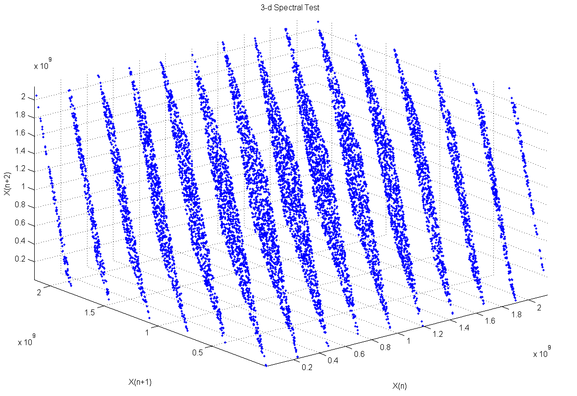 An example of a bad generator is shown in the next figure. It is the famous RANDU Generator which is mostly used for the rand() function in C programming languages.