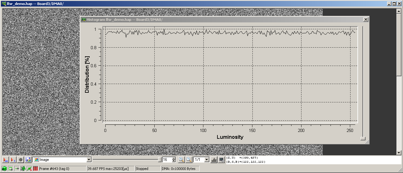 The operator can fully be simulated in VisualApplets. However, the non-deterministic hardware implementation cannot be implemented in software for simulation. Therefore, a very simple random number generator with bad quality is used in the simulation. (rand() function of the MS VisualStudio) If seeds are not changed, the operator will always generate the same sequences.