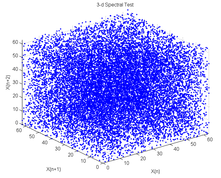 A spectral test tests the generator on serial correlation. No patterns should be visible in the generated sequences. Bad generators show hyperplanes in the two- or three-dimensional space. The VisualApplets generator does not show any hyperplanes:
