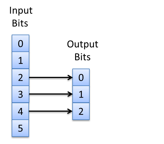 See the following figure for explanation. In this example, the output transports 3 bits cut from the 6 bit input values with an offset of two. For example, input value 20 will become 5.