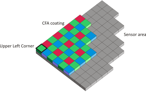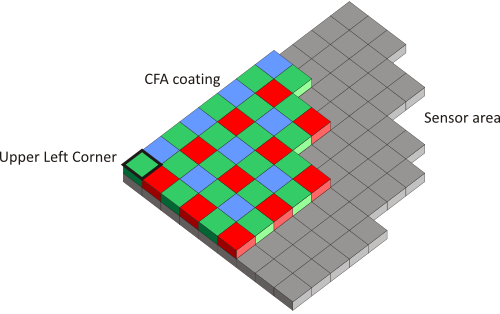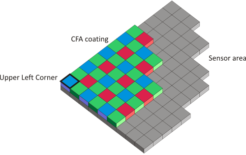The Bayer array configuration of the camera must match the operator settings. The operator setting is changed using parameter BayerInit. Four different mappings of the Bayer array on the sensor are possible: