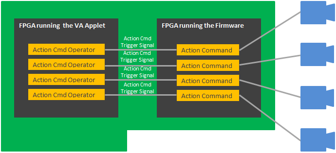 The operator Action Command sends an action command trigger signal to the firmware. On receiving this trigger signal, the firmware sends a preconfigured action command to the GigE Vision camera.