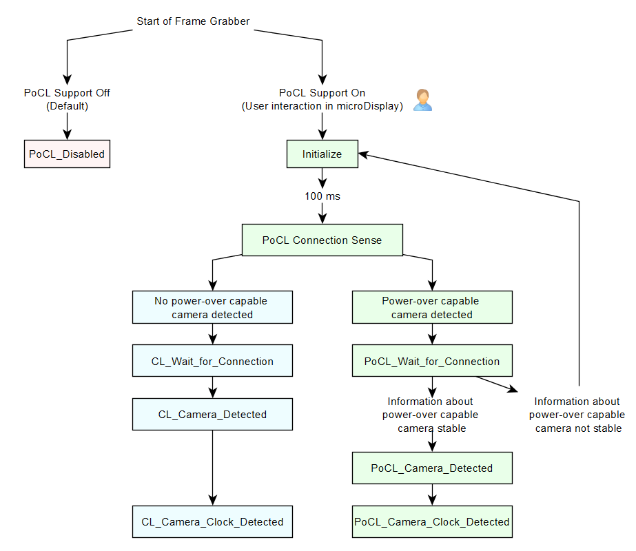 If PoCL has been enabled in microDiagnostics (or the applet has been built with VisualApplets 3.0.4 or prior), the individual states of the Power over Camera Link (PoCL) state machine indicate the following: Initialize: This state has a duration of 100 ms. During this period, PoCL detection as well as PoCL operation is off. This way, the board establishes a defined initial state with no voltage applied. PoCL_Connection_Sense: This state has a duration of 600 ms. It follows directly of state Initialize. During this state, the controller finds out if the connected camera is PoCL-capable or not.