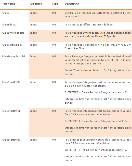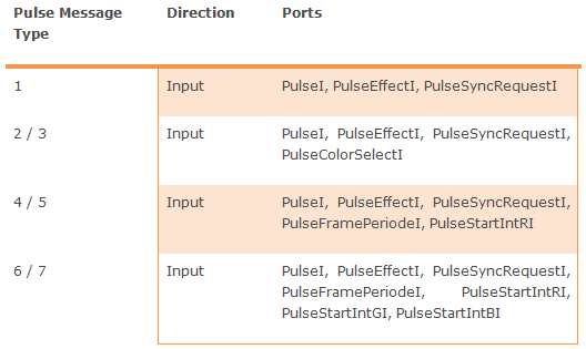 Depending on the type of the messages, also ports PulseColorSelectI, PulseFramePeriodeI, PulseStartIntRI, PulseStartIntGI, and PulseStartIntBI need to be connected sensibly. If these ports are not used, they nevertheless need to be connected. But in this case it doesn't matter what they are connected to.