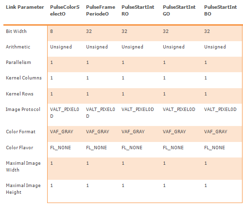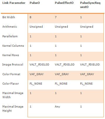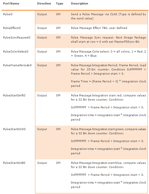 When a pulse message has been received, at out port PulseO a 0D pixel with a mode-of-message field is generated. The parameters of the pulse message are output on the according link o-synchroneously.