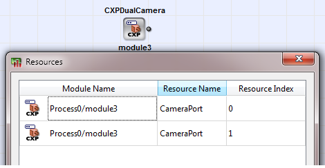 The CameraID parameter defines the CXP master port ID to the firmware of the camera operator to allow automatic CXP topology discovery (camera-to-applet and applet-to-camera). By using this parameter, you can specify the ID directly here in the operator. However, we recommend to specify the resources of the operator in the Resources dialog. (To open the Resources dialog, simply highlight the camera operator and select from the Design menu the menu item Resources.) The CameraID parameter will automatically update to the correct master port, using the resource dialog parameters. The following example is using one single camera and one dual camera: ![]()