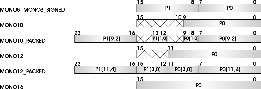 This operator can be configured to support the different data formats specified by the GigE Vision standard. The following figure illustrates the data formats.