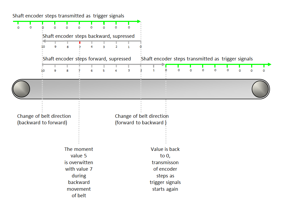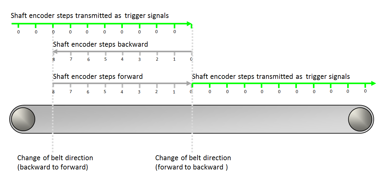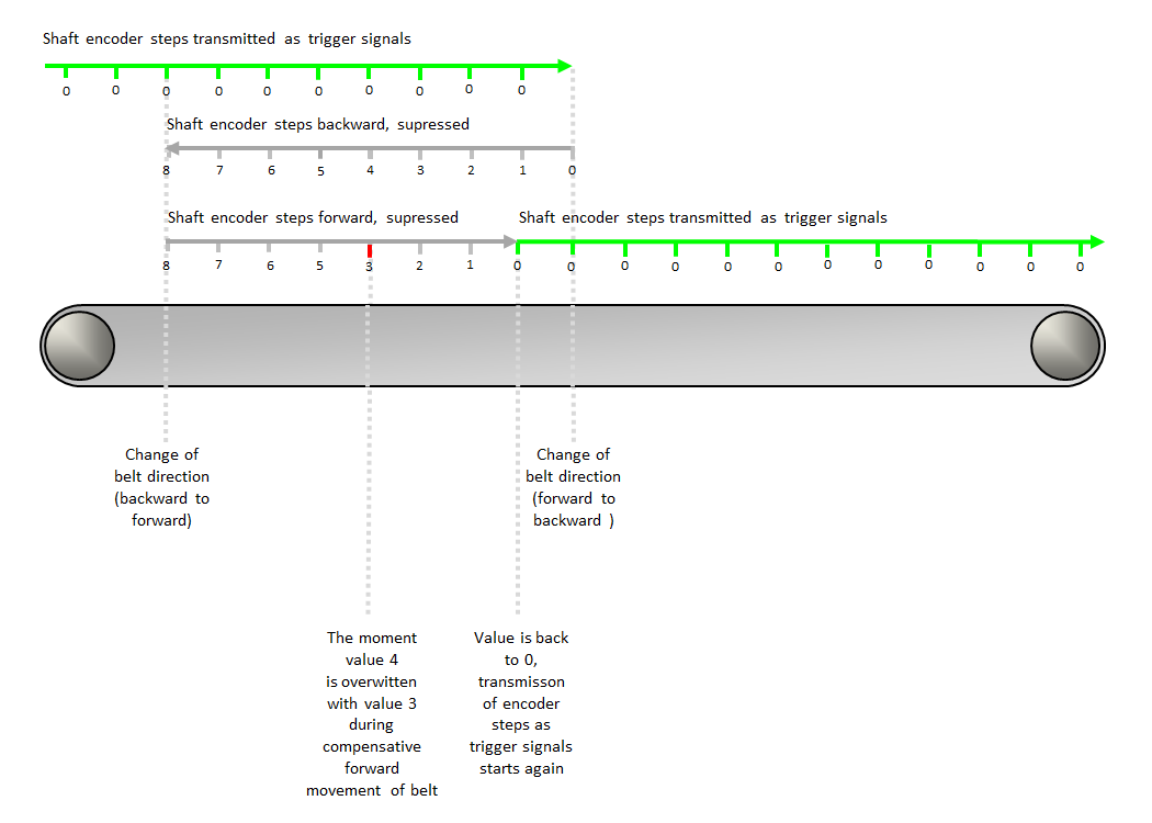 OFF If switched to OFF, the operator simply doesn't transmit any trigger signals as long as the transportation belt moves backwards. As soon as the transport belt starts to move forwards again, the operator transmits the shaft encoder steps (forward direction) as trigger signals. Parameter EncoderCompensation = OFF: ![]()