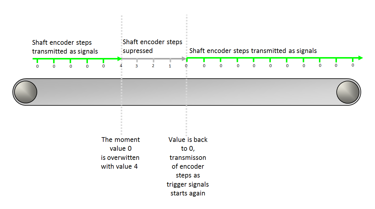 Example 4: The transportation belt is moving forward during compensation, the (forward) shaft encoder steps are supressed, and the value of EncoderCompensationCount is ≠0. Then, during compensative forward movement of the transportation belt, the value 4 of EncoderCompensationCount is overwritten with a smaller value, in our case with value 3. Result: Negative offset of -1 shaft encoder step. ![]()