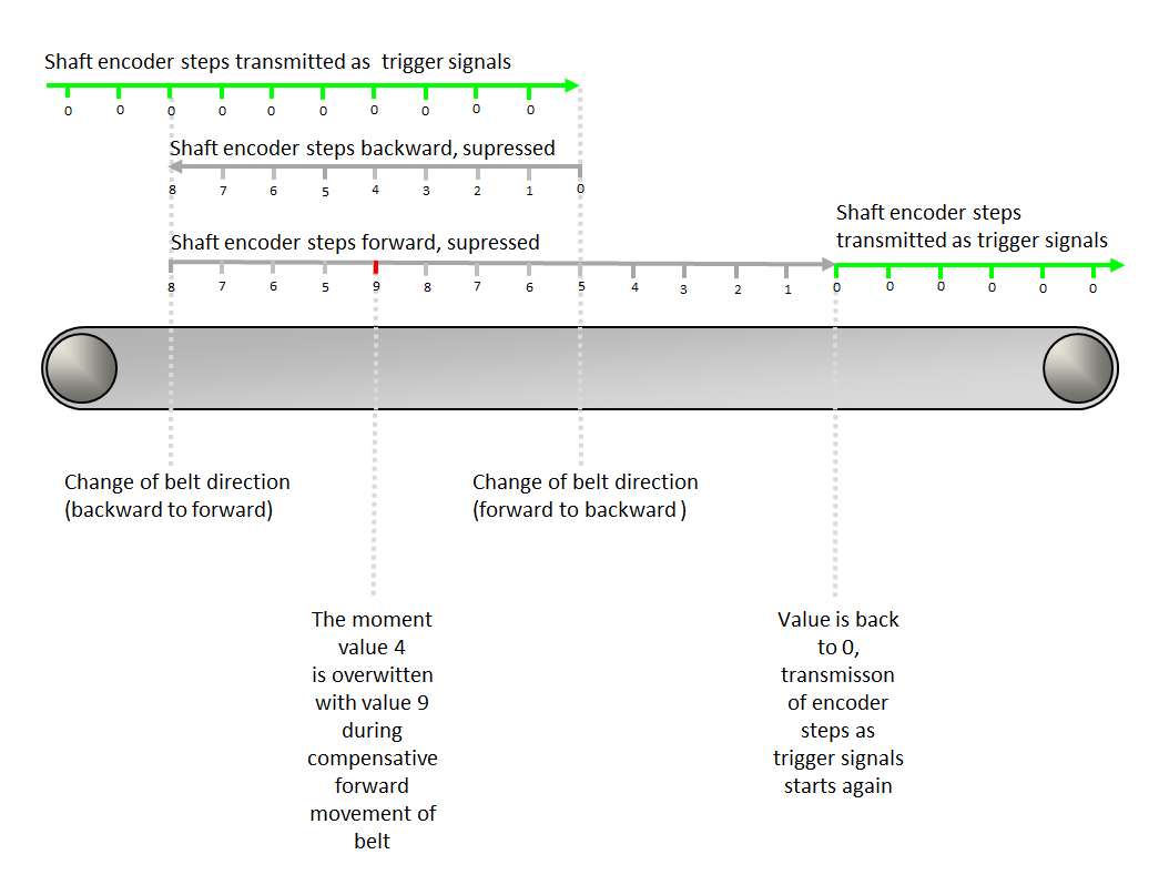 The internal counter counts forwards as long as the transportation belt moves backwards. (In the figure above, from 0 to 8.) The internal counter counts backwards while the transportation belt moves forwards. (In the the figure above, from 8 to 0.) When the internal counter holds the value 0, the shaft encoder steps are transmitted as trigger signals. The value the internal counter holds at a given moment is the value of parameter EncoderCompensationCount. Only if this value is 0, encoder steps are transmitted as trigger signals. If the value of parameter EncoderCompensationCount is ≠0, the shaft encoder steps are not transmitted as trigger signals and the value keeps changing with every encoder step until it reaches the value 0 again. Reading the Parameter Parameter EncoderCompensationCount is a read/write parameter. Therefore, at any given moment, you can always read out the value the counter holds at a given moment. Defining an Offset On the other hand, you can always modify the parameter value since you have write access during acquisition. If you need to define an offset to the standard encoder compensation, you can use this parameter to enter the number of steps you need the offset to be. As soon as you enter a value for EncoderCompensationCount, this value overwrites the value the parameter holds before. Let's look at some examples for overwriting the current value of EncoderCompensationCount: Example 1: The transportation belt is moving forward, the shaft encoder steps are transmitted as trigger signals, and the value of EncoderCompensationCount is 0. Then, the value 0 of EncoderCompensationCount is overwritten by value 4. Result: 4 shaft encoder steps are not transmitted as trigger signals. ![]()
