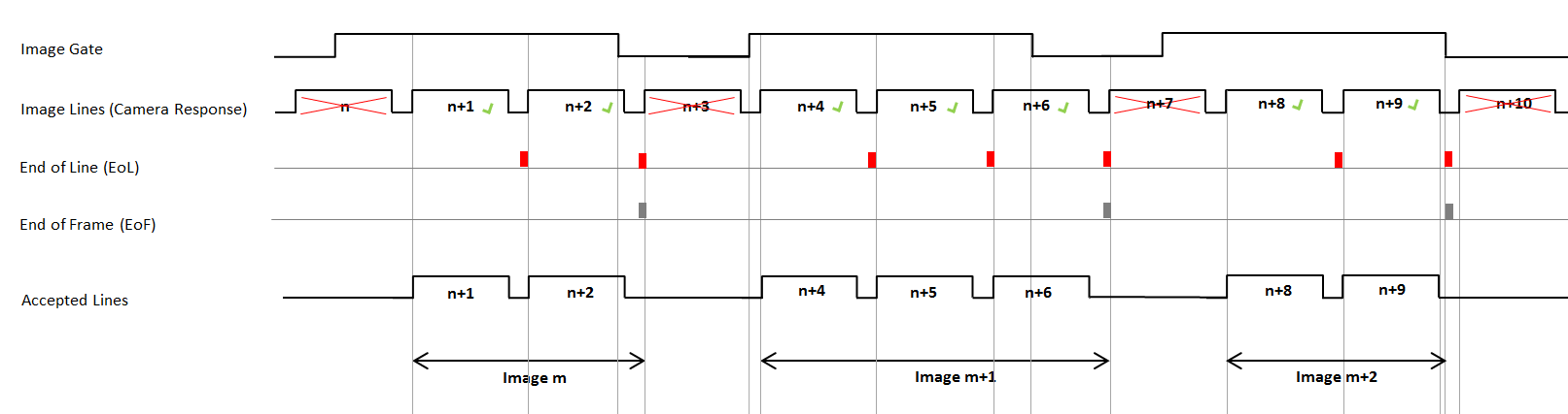This parameter selects the operation mode for the internal Image Gate. The image trigger input signal may be created by external (peripheral) devices (e.g., shaft encoder), or by software. The source for the external image trigger input you can select via the parameter ImgTrgInSource, see below). The values of parameter ImgTriggerMode induce the following behaviour: