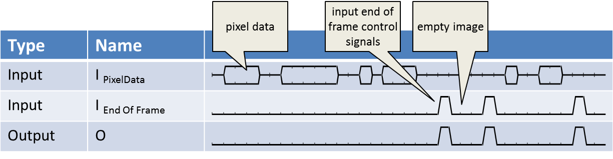 The operator generates a signal pulse when the end of the input image is detected. The operator input is an image stream. The operator waits for the end of the input image stream. When the frame end is detected, a signal pulse of one clock cycle is output. Note that the end of a frame might not occur directly after the last frame pixel. See the following figure for explanation: