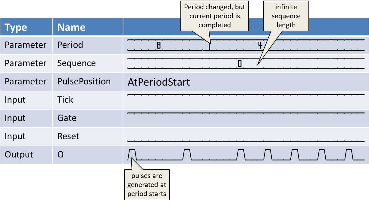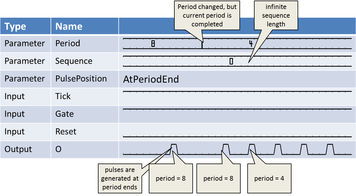 The period is defined using the parameter Period. The period is dynamic. Its range is defined by the parameter PeriodBits. In the following figure, the generation of pulses with period lengths eight and four are shown.