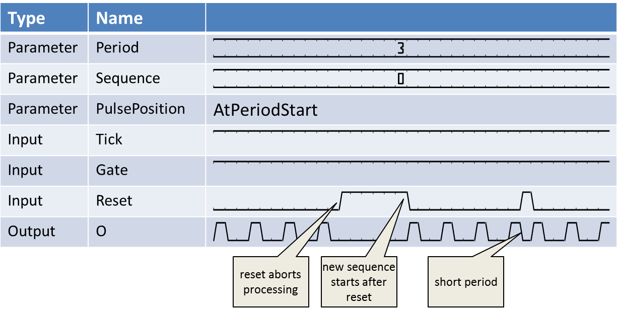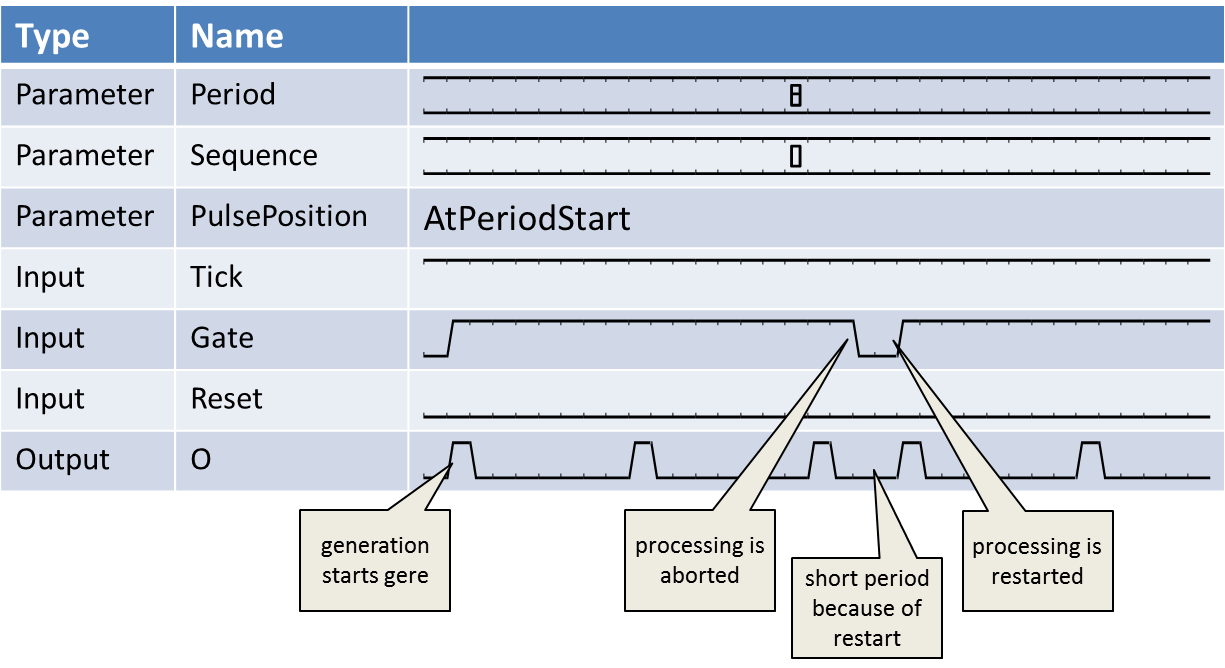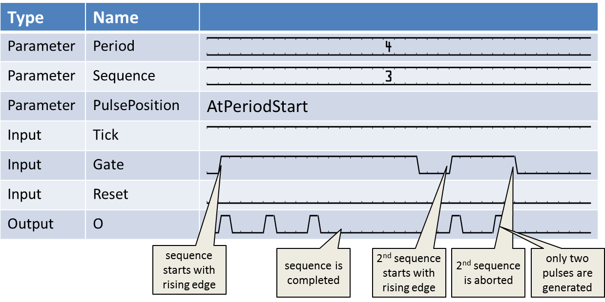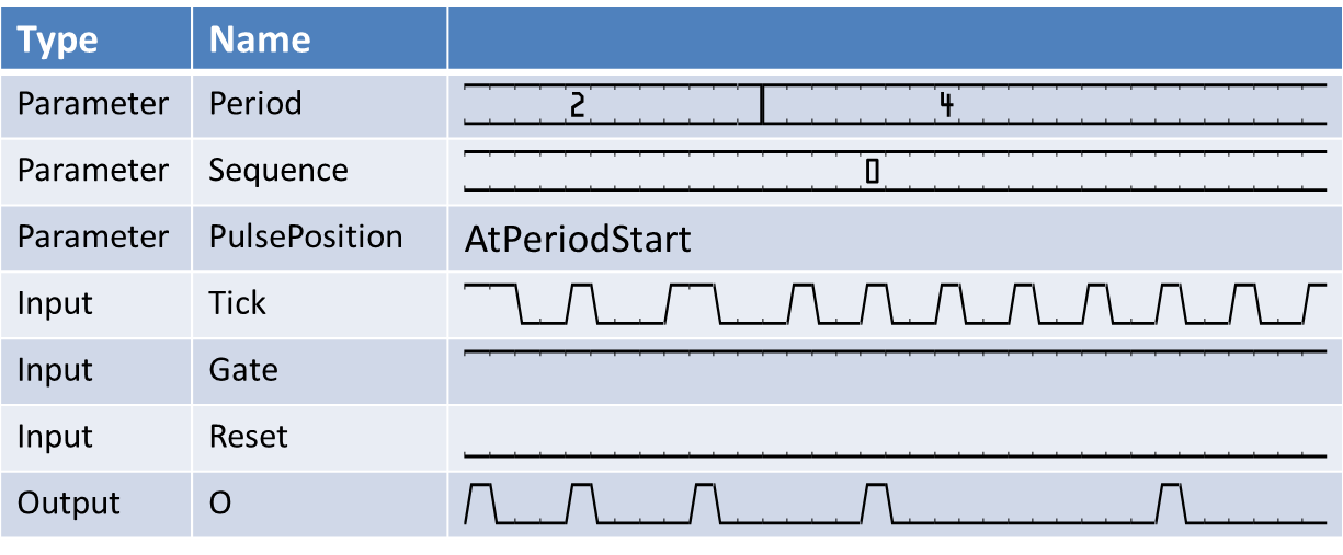 The pulse generation can either be at the end of the period or at the start as is controlled using the parameter PulsePosition. The next figure shows the generation at the start of a sequence.