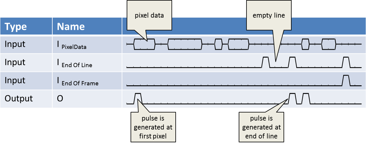 The operator generates a signal pulse when the start of an input image line is detected. The operator input is an image stream. The operator waits for the first pixel at each input image line. When the first pixel is detected, a signal pulse of one clock cycle is output. See the following figure for explanation: