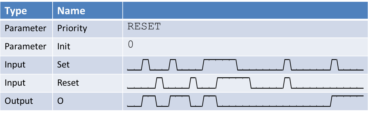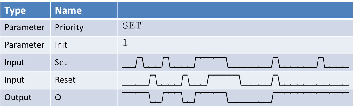 The operator implements a set-reset flip-flop. If a one (HIGH) is at input link Set, the operator sets the output value to HIGH and keeps the value until a zero (LOW) is present at input link Reset. When Reset is set to HIGH, the output value on output link O is set to LOW. Parameter Priority is used to define if Set or Reset is the master. The value defined with parameter Init is output at startup. See the following truth table and waveform for explanation.