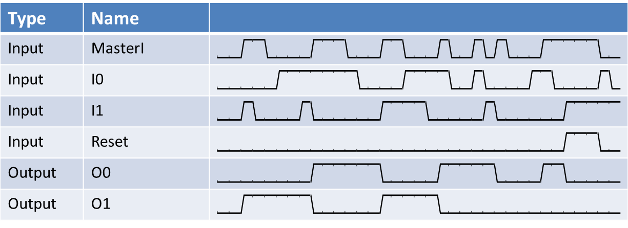 The operator synchronizes N input links to the master signal and provides the synchronized version of the inputs at the outputs. For each rising edge at input link MasterI, the inputs I0..In are sampled. Thus the operator includes N registers, enabled with the rising edges of MasterI input. See the following waveform for illustration.