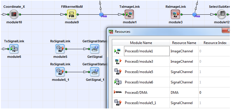 Each TxSignalLink operator in a design is connected to at least one RxSignalLink operator via one channel ID. In the Resource Dialog of VisualApplets, you can see that each TxSignalLink operator uses one resource SignalChannel exclusively. Resource SignalChannel allows to control the assignment of individual TxSignalLink operators to one or multiple RxSignalLink operators. For the number of available SignalChannel resources (which also defines the maximum number of allowed TxSignalLink operators in a design), see Device Resources.