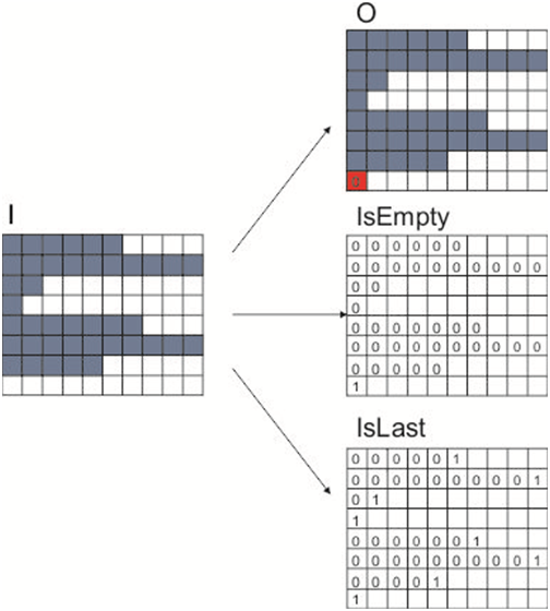 On output port IsLastO, the empty line gets a 1, that is, the empty line looks the same as the fourth line of the example which contains one pixel already when incoming on input port I. Thus, when output port IsEmptyO is activated, the output on port IsLastO can only be interpreted in conjunction with the output on port IsEmptyO.