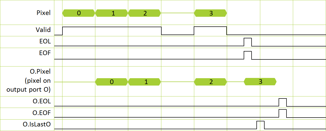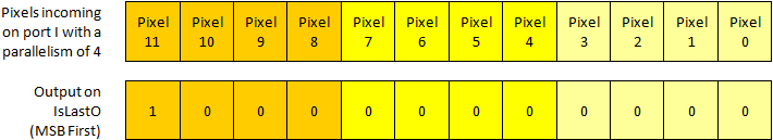 If parallelism > 1, only the last pixel within the parallelism (highest bit) is marked with a 1 on output port IsLastO. All other pixels of the parallelism are 0. Example: When Parallelism=4, at the last parallel word the output port IsLastO is 0x8, but in all other cases 0: ![]() |