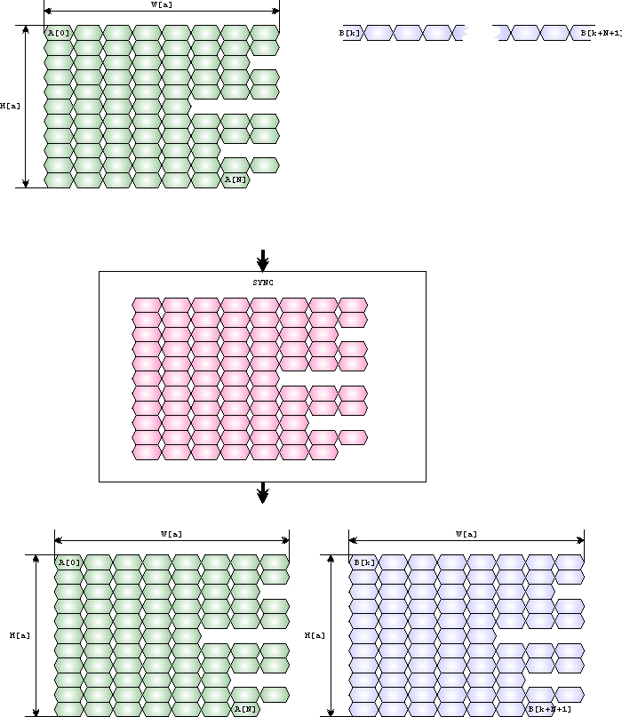 The operator SYNC performs time and image dimension synchronization of all input links. The number of links which have to be synchronized is specified upon operator instantiation. The output images on all output links are synchronous, i.e., they are output at the same time and they all have the same image dimension. Thus, the operator synchronizes asynchronous links so that they are O-synchronous and can be used in an O-type VisualApplets operator network.