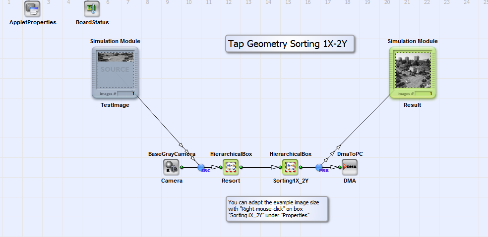 The sorting of the tap geometry modi described above is implemented in seven seperate Visual Applets designs. The designs can be used as part of image processing designs. For the simulation and test of the tap geometry sorting you find example images under \examples\Processing\Geometry\TapGeometrySorting\TestImages. The implementation algorithm differs from design to design to find the best balance between complexity and resource efficiency of the implementation. The simplest way to realize tap geometry sorting in horizontal direction is realized in the designs "TapSorting_2X_1Y.va" and "TapSorting_2XE_1Y.va". You can see the basic design structure of "TapSorting_2XE_1Y.va" in Fig. 363.