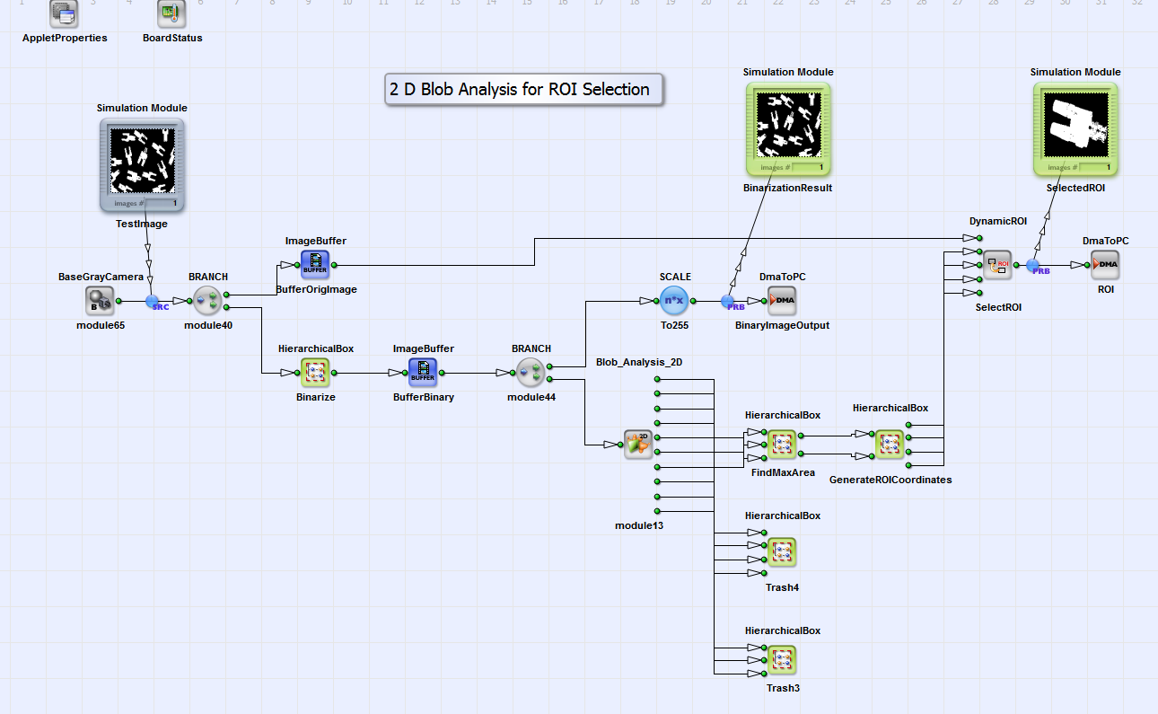 Short Description The blob analysis operator is applied to an input camera image. The applet shows the usage of the blob data in the applet. In this case, the object with the maximum are is localized and the coordinates are used to cut out the object from the original image. |