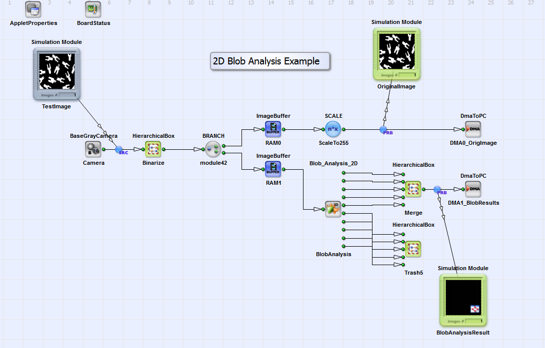 Short Description Shows the usage of operator Blob_Analysis_2D. The applet binarizes the input data and determines the blob analysis results. The results as well as the original image are output using two DMA channels. The Blob_Analysis_2D operator is a legacy operator, kept only for backward compatibility reasons. In new designs, use BlobDetector2D instead. See also the example 'BlobDetector2D'. |