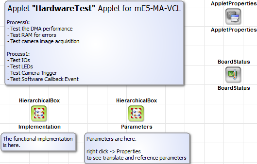 The VisualApplets implementation is split into two processes. Process0 includes all image processing parts namely the DMA test, RAM test and camera acquisition. Process1 instead includes the parts which are independent of a running acquisition. As processes without DMA operators are immediately started when the applet is loaded, the functions here can be used independently of an acquisition. See 'Processes without DMAs / Trigger Processes' for more information.