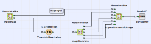 In VisualApplets a design is implemented with the original image and geometric properties like the area, the center of gravity, the orientation and the eccentricity of an object as output. You can find the example under \examples\Processing\Geometry\ImageMoments\ImageMoments.va. A parallelism of 4 was chosen for calculation. In Figure 346, 'Basic design structure' the structure of the design with comments is shown.