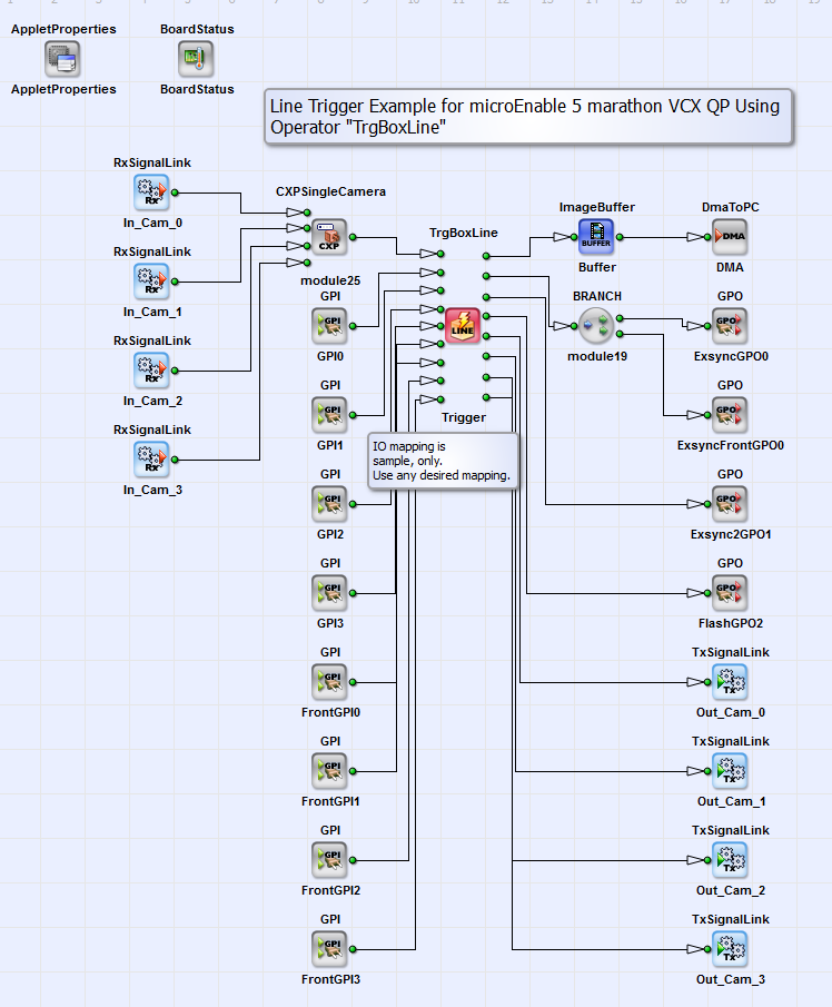 Short Description VisualApplets prototype operator TrgBoxLine can be used for for line scan triggering. The operator includes multiple triggering features. The example demonstrates the usage of the operator in a VisualApplets design file for mE5-MA-VCX-QP platform. For parameters of "TrgBoxLine" on this platform please read corresponding operator documentation under 'TrgBoxLine' Note that in comparison to operator TrgPortLine on mE4VD4-CL/PoCL the operator does not directly control the IOs. Therefore, it is required to connect to the IOs respectively. |