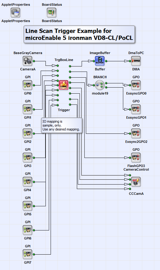 Short Description VisualApplets prototype operator TrgBoxLine can be used for microEnable 5 and microEnable IV platforms for line scan triggering. The operator includes multiple triggering features. The example demonstrates the usage of the operator in a VisualApplets design file for mE5VD8-CL/-PoCL platform. For parameters of "TrgBoxLine" on this platform please read corresponding operator documentation under 'TrgBoxLine' Note that in comparison to operator TrgPortLine on mE4VD4-CL/PoCL the operator does not directly control the IOs. Therefore, it is required to connect to the IOs respectively. The operator is in prototype library and might be replaced in future releases. |