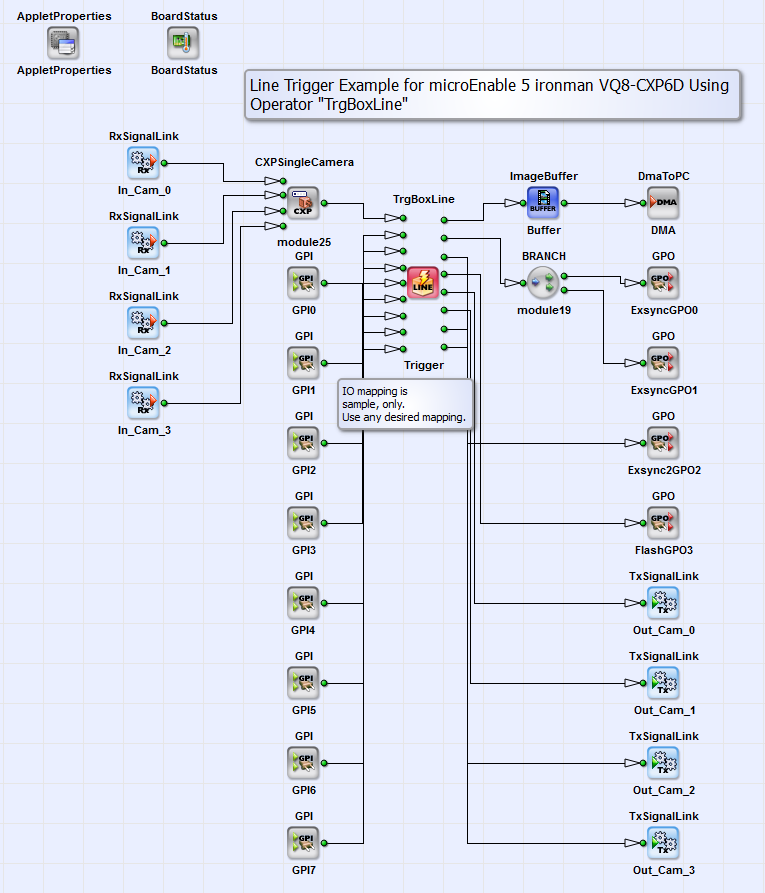 Short Description VisualApplets prototype operator TrgBoxLine can be used for microEnable 5 and microEnable IV platforms for line scan triggering. The operator includes multiple triggering features. The example demonstrates the usage of the operator in a VisualApplets design file for mE5-VQ8-CXP6D/mE5-VQ8-CXP6B platform. For parameters of "TrgBoxLine" on this platform please read corresponding operator documentation under 'TrgBoxLine' Note that in comparison to operator TrgPortLine on mE4VD4-CL/PoCL the operator does not directly control the IOs. Therefore, it is required to connect to the IOs respectively. The operator is in prototype library and might be replaced in future releases. |