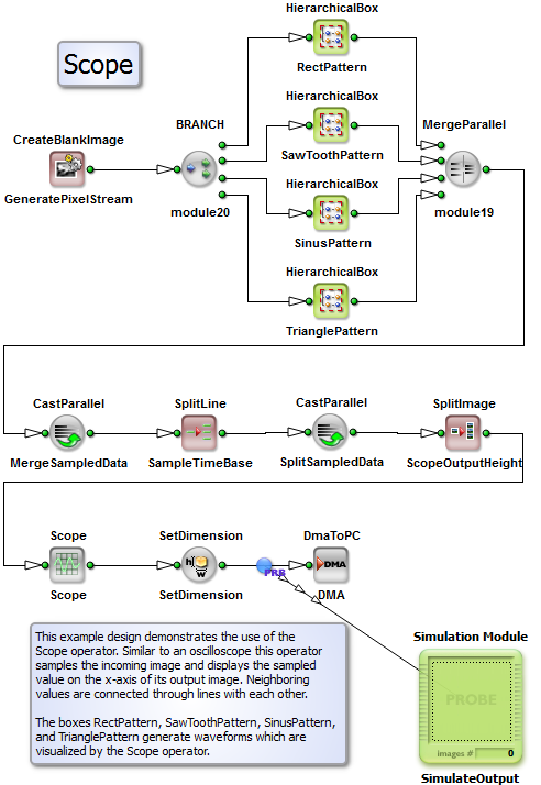 Short Description The Scope operator provides options for analyzing gray-scale pictures. The operator outputs a 2D waveform for each image channel by sampling input image lines. Up to four channels are supported. In a channel, each incoming line is sampled once. According to the settings you define in parameter SampleMode, the gray scale value of the first pixel in the line, the last pixel in the line, the smallest pixel value in the line, or the greatest pixel value in the line is used for sampling. |